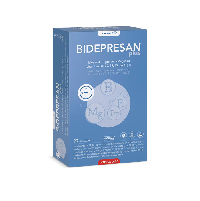 Bipole Bidepresan Plus da Dietéticos Intersa é um complemento alimentar formulado à base de geleia real, vitaminas, triptofano e magnésio na forma de práticos frascos de 15ml cada, para tomá-los rapidamente e aproveitar os benefícios destes compostos no organismo.