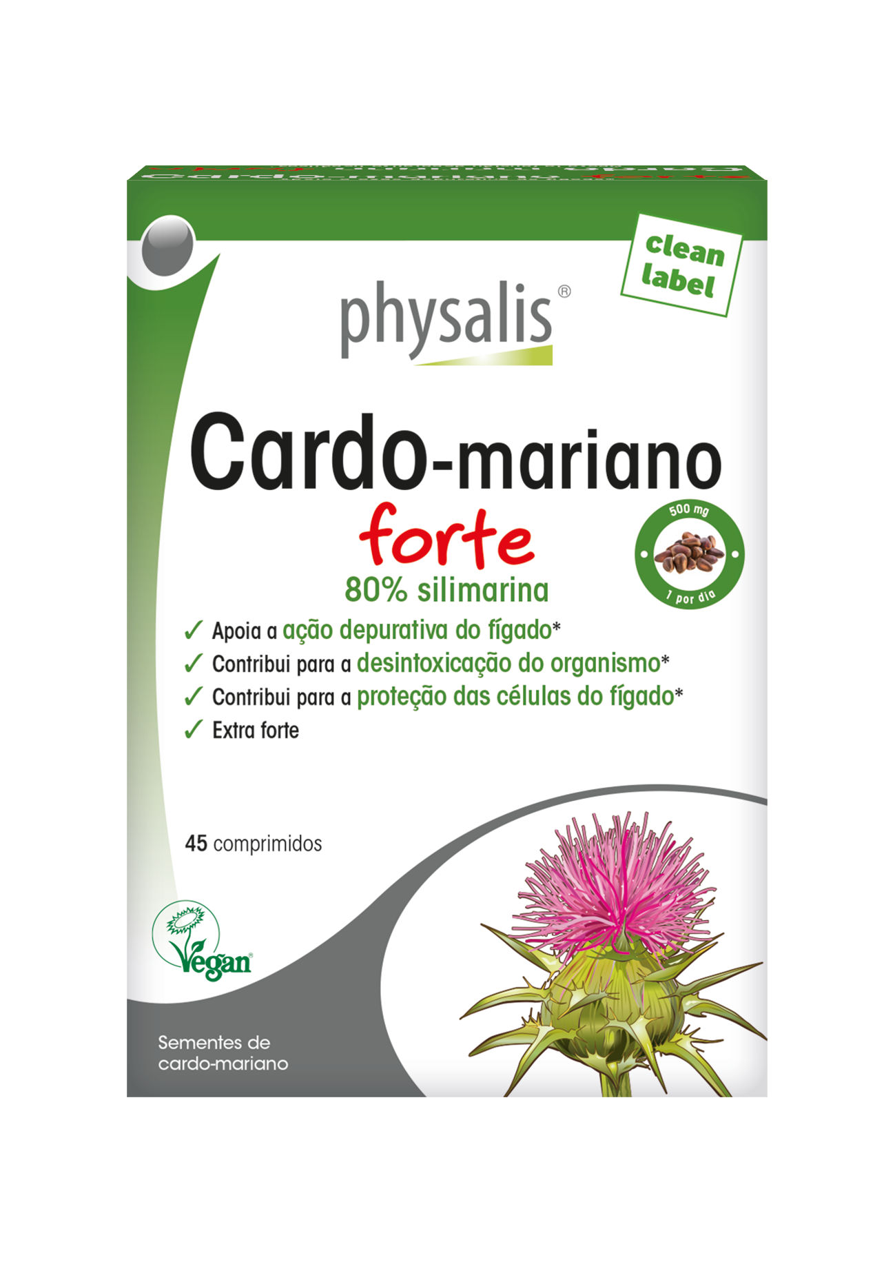 Physalis Cardo-mariano forte contém 500 mg de extrato de cardo-mariano, padronizado em 80% de silimarina. *O cardo-mariano, que suporta a função de depuração e desintoxicação do fígado, é particularmente adequado para acompanhar uma cura de purificação. O cardo-mariano contribui para a proteção das células (fígado) e favorece um bom metabolismo dos açúcares.