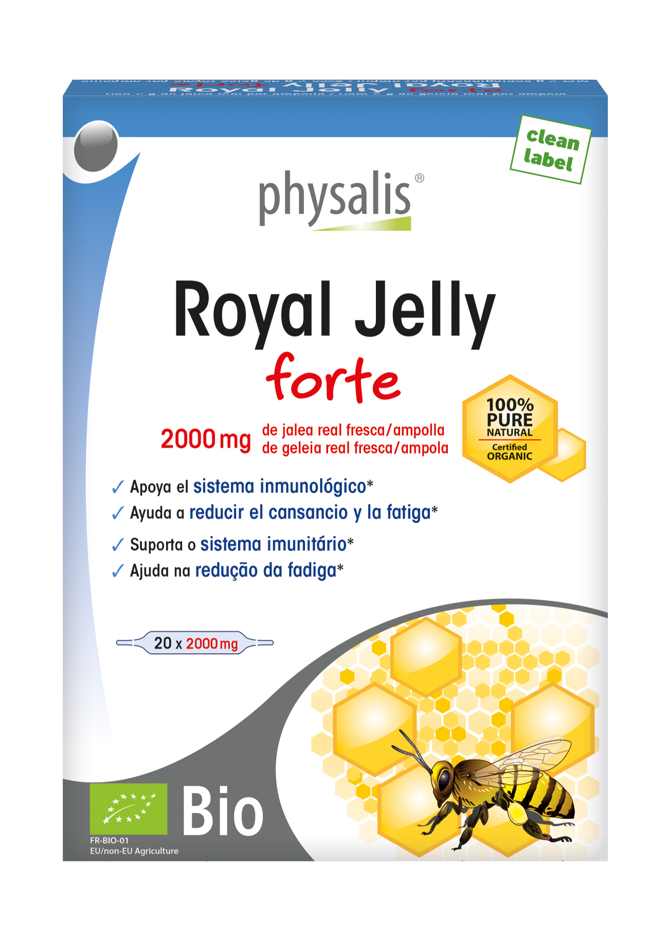 Physalis Royal Jelly forte bio contém uma dosagem elevada de geleia real biológica (2 g por ampola). Esta geleia real é cuidadosamente selecionada e colhida por apicultores qualificados, o que garante a sua qualidade. Além disso, este complexo contém também extrato de acerola e mel de flores de origem europeia.