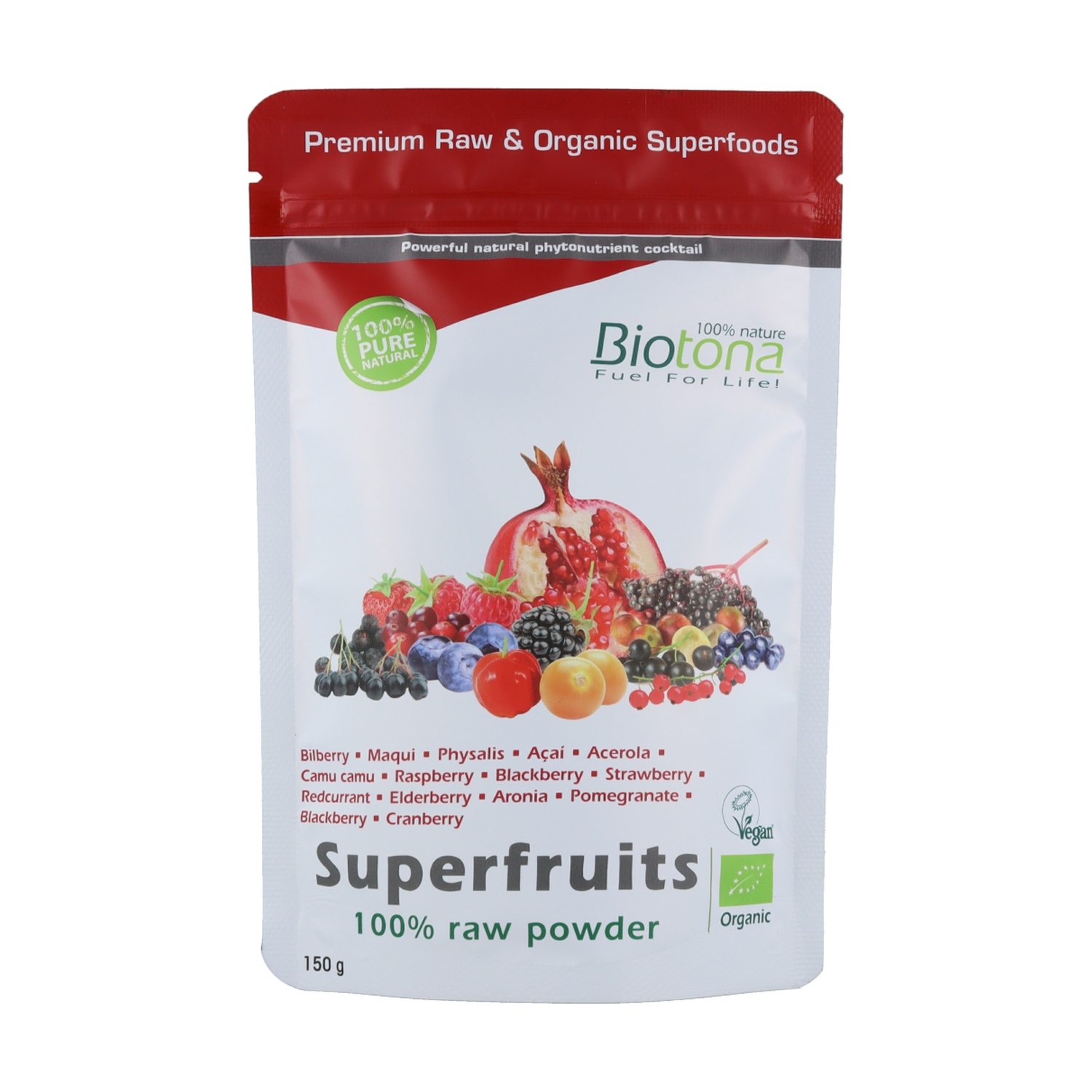Contém morango, açaí, acerola, arónia, mirtilos, amoras-silvestres, camu camu, arandos vermelhos, framboesas, romã, maqui, groselha vermelha, sabugueiro groselha negra e amoreira preta. Todas as bagas nesta mistura são de cultivo100% biológico.